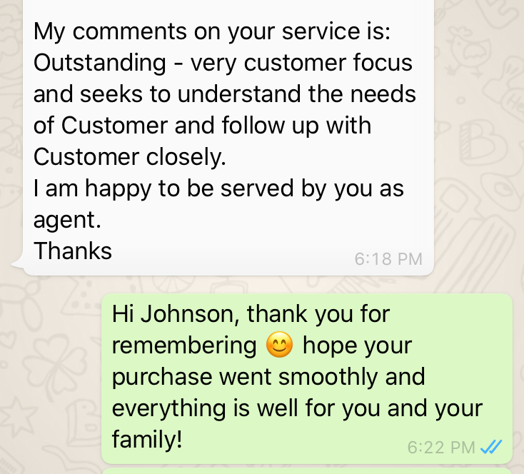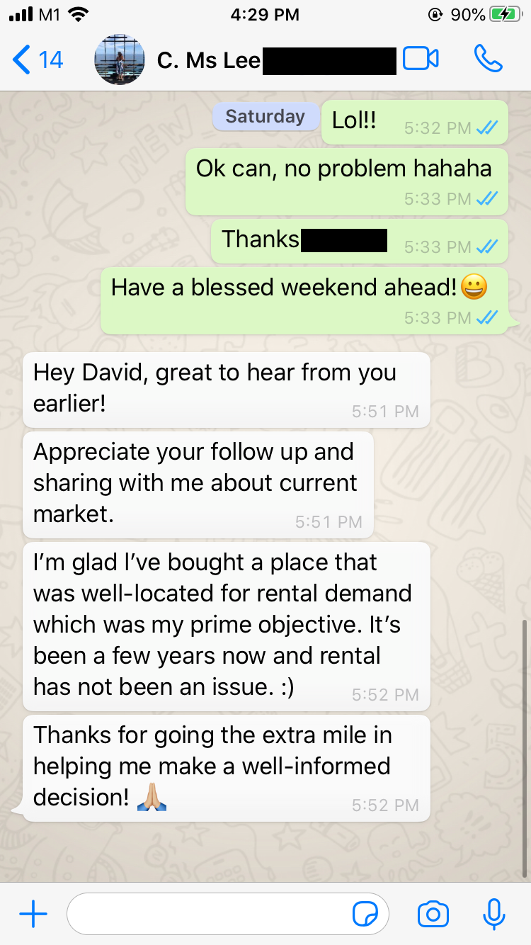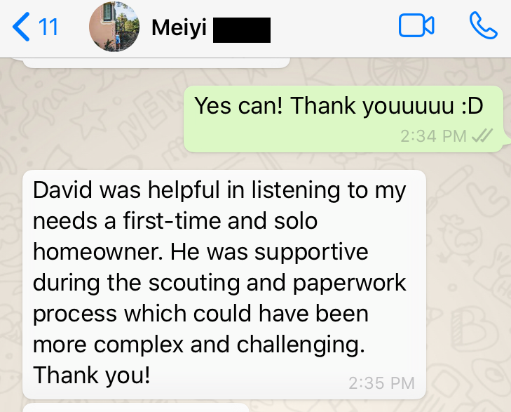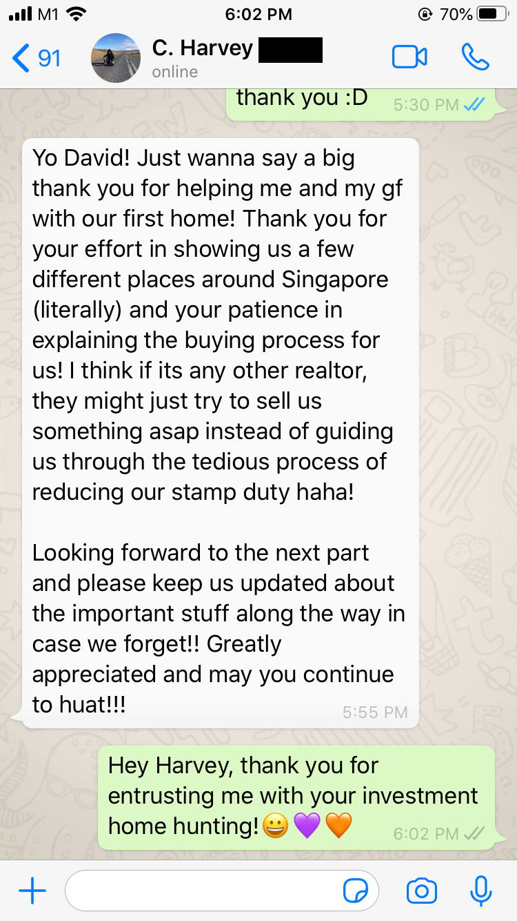 "Just wanna say a big thank you for helping me and my gf with our first home!... I think if its any other realtor, they might just try to sell us something asap instead of guiding us through the tedious process of reducing our stamp duty..."
